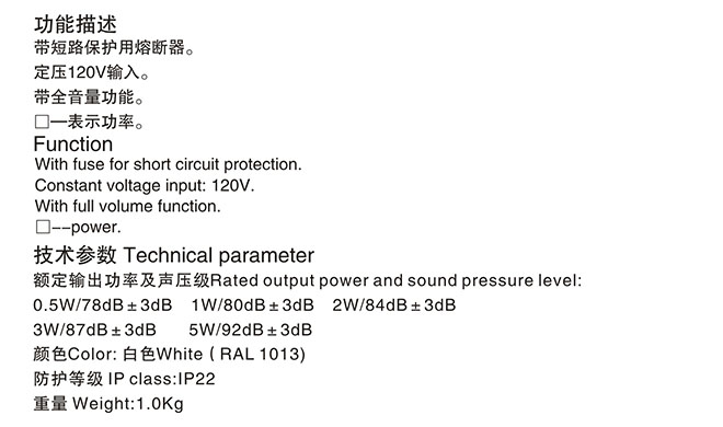 | 功率: | 3W | 聲壓等級: | 87dB |