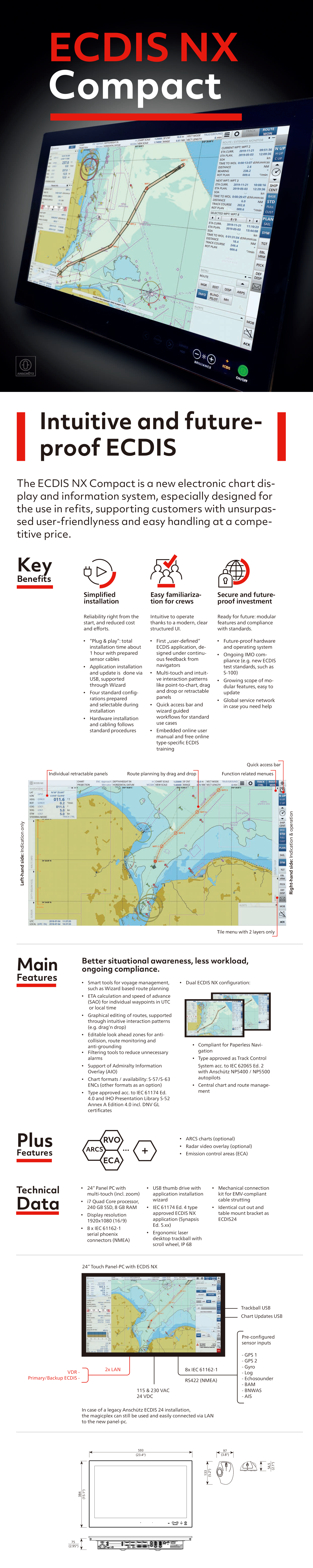 | 性能亮點: | Simplified installation and “Plug & play”; Intuitive to operate thanks to a modern, clear structured UI; Modular features and compliance with standards; Smart tools for voyage management; Compliant for Paperless Navigation | ||